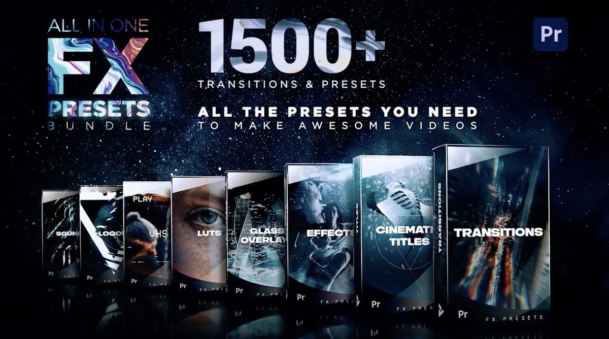 让您轻松拥有电影级的视觉特效、PR转场素材、背景音效和调色预设,约1500组
