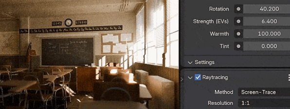 屏幕空间全局光照:简化灯光设置,EEVEE能自动提取强光源并处理为太阳光,提升照明质量。
