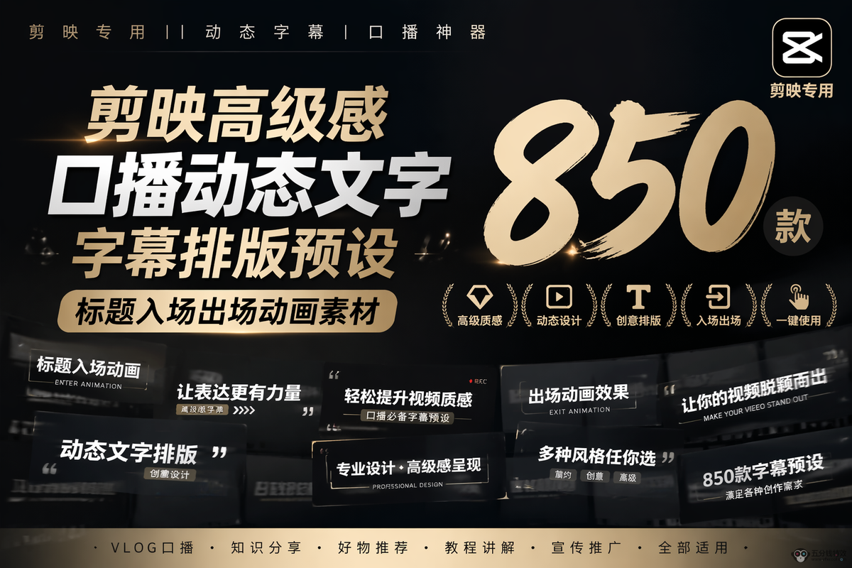 约 220MB 的合集里,集成了 850 款高级感口播动态文字、字幕、标题及入场 / 出场动画,还附带音效与动画效果。只需一键拖拽,就能轻松生成商业级字幕排版。